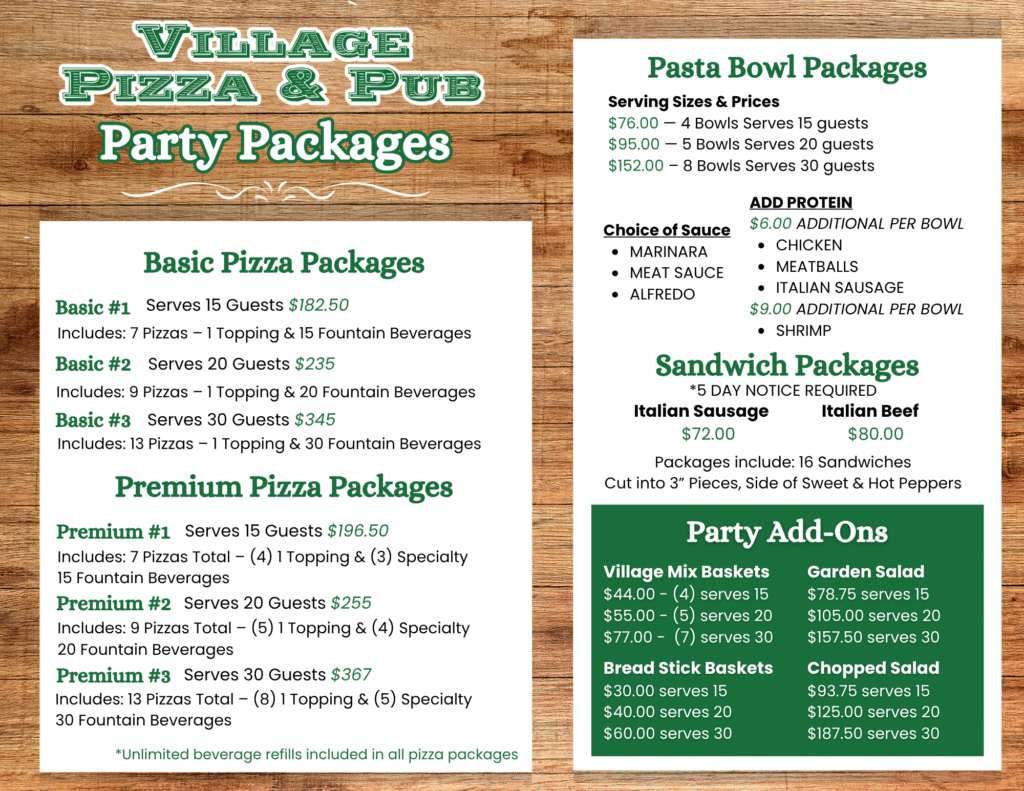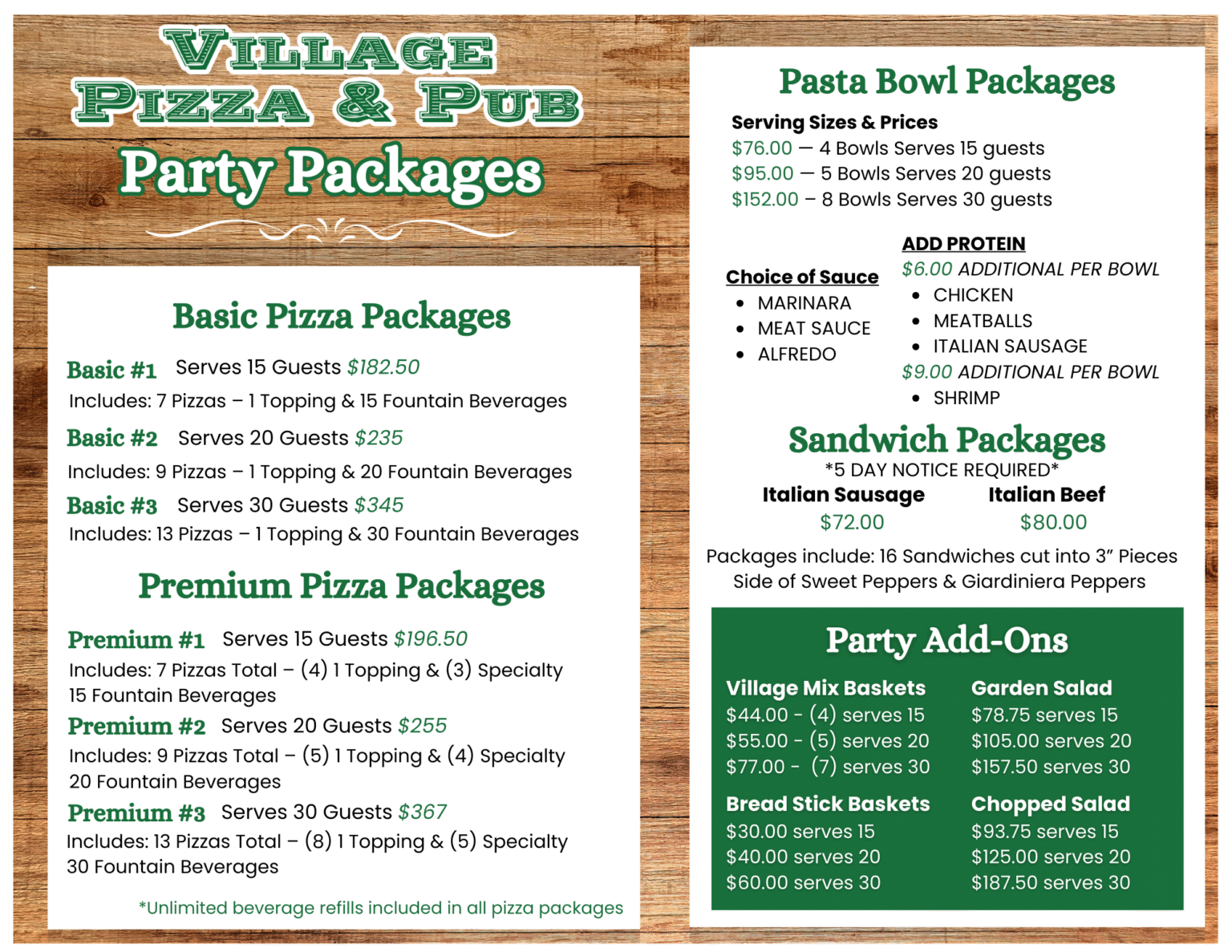 Village Pizza and Pub is a great place to hold your next gathering! Either of our locations will make your special day all it can be. Please see our party details below or feel free to call us so we can help you plan!